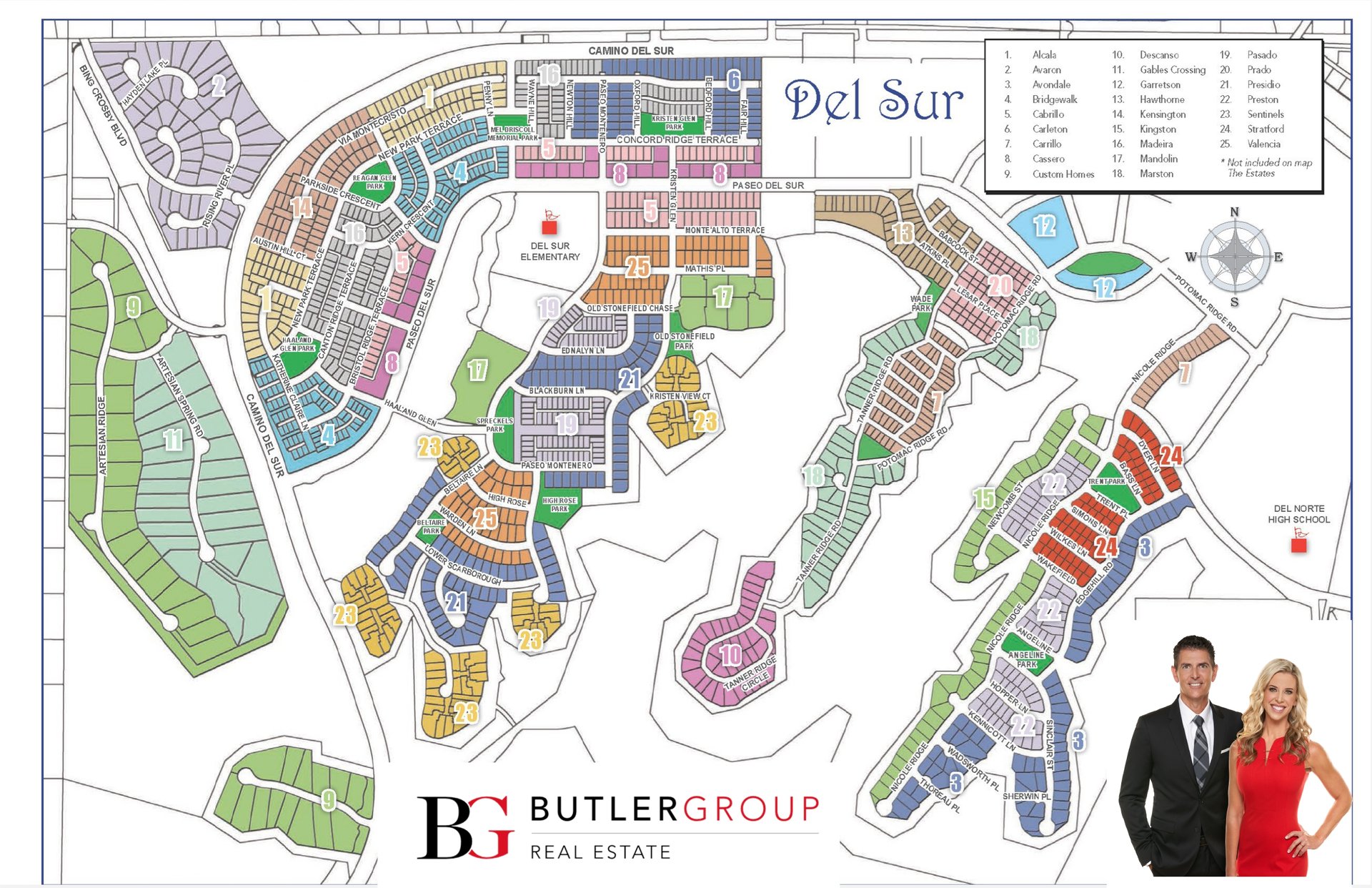 Del Sur is the modern luxury master-planned community in North County San Diego, designed for high earning families who want structured community living and guaranteed access to top public schools. Situated in Southern California, Del Sur offers regional appeal with proximity to beaches, parks, and urban amenities. The community’s identity is built on being one of the most popular luxury neighborhoods in San Diego, so you know what to expect and what you’ll pay. The scope of real estate expertise in this North County area is vast, from 4S Ranch to The Crosby, Rancho Santa Fe, The Lakes Above Rancho Santa Fe, Torrey Highlands, Pacific Highlands Ranch and Carmel Valley. Julie Butler and David Butler are the top real estate professionals in this area.